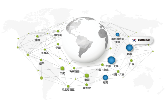 登騰除韓國(guó)總部外,分別在中國(guó),俄羅斯,美國(guó),迪拜,泰國(guó),德國(guó)以及新加坡設(shè)有分公司。